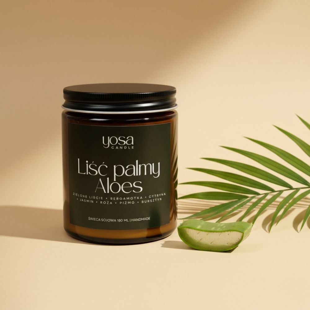 Świeca sojowa Liść Palmy i Aloes to wyjątkowa kompozycja inspirowana tropikalnym ogrodem, w którym soczysta zieleń łączy się z delikatnością aloesu. Świeże nuty liści palmowych, cytrusowa bergamotka i cytryna dodają lekkości, podczas gdy kwiatowe akcenty jaśminu i róży wprowadzają subtelną elegancję. Całość dopełnia ciepła baza białego piżma i bursztynu, otulając przestrzeń kojącym aromatem. To idealny wybór na codzienny relaks, chwile odprężenia i stworzenie atmosfery spokoju w Twoim domu.